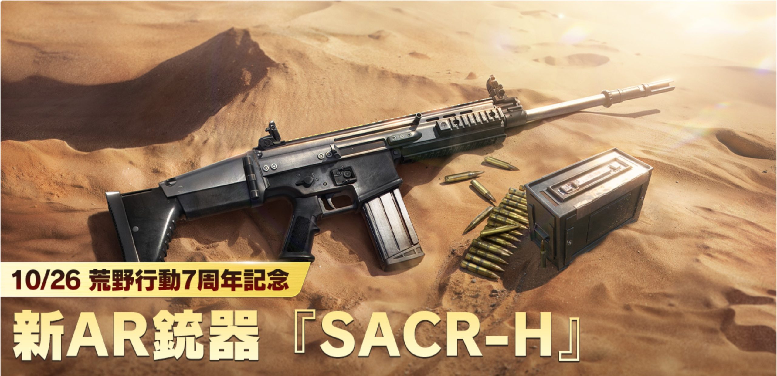 2024年10月26日、荒野行動は7周年を迎え、記念として新たなアサルトライフル「SACR-H」が追加されることが発表されました。今回の発表は、武器バランスや戦略的な選択肢を広げるアップデートの一環として注目されています。画像にあるように、砂漠の中に置かれたSACR-Hはリアルな質感で描かれ、現実の銃器とのデザイン的な共通点を強調しています。
