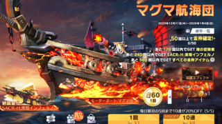 2025年12月~2026年1月開催のマグマ航海団のまとめページです。乗り物モーターボート:マグマ号レベルアップ レベル名前キーランク進化必要なチケット効果1モーターボート:マグマ号 Ⅰ3000ーー2モーターボート:マグマ号 Ⅱ3500車両...