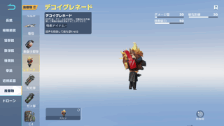 デコイグレネード基本データ威力20射程距離20移動能力502025年8月21日アップデートで登場した投擲物。着地点にミニジャック登場し様々な種類の銃声を15秒間鳴らす。ダメージを与える効果は無し。構えてから6秒経つと自動で投げる。ダメージを...
