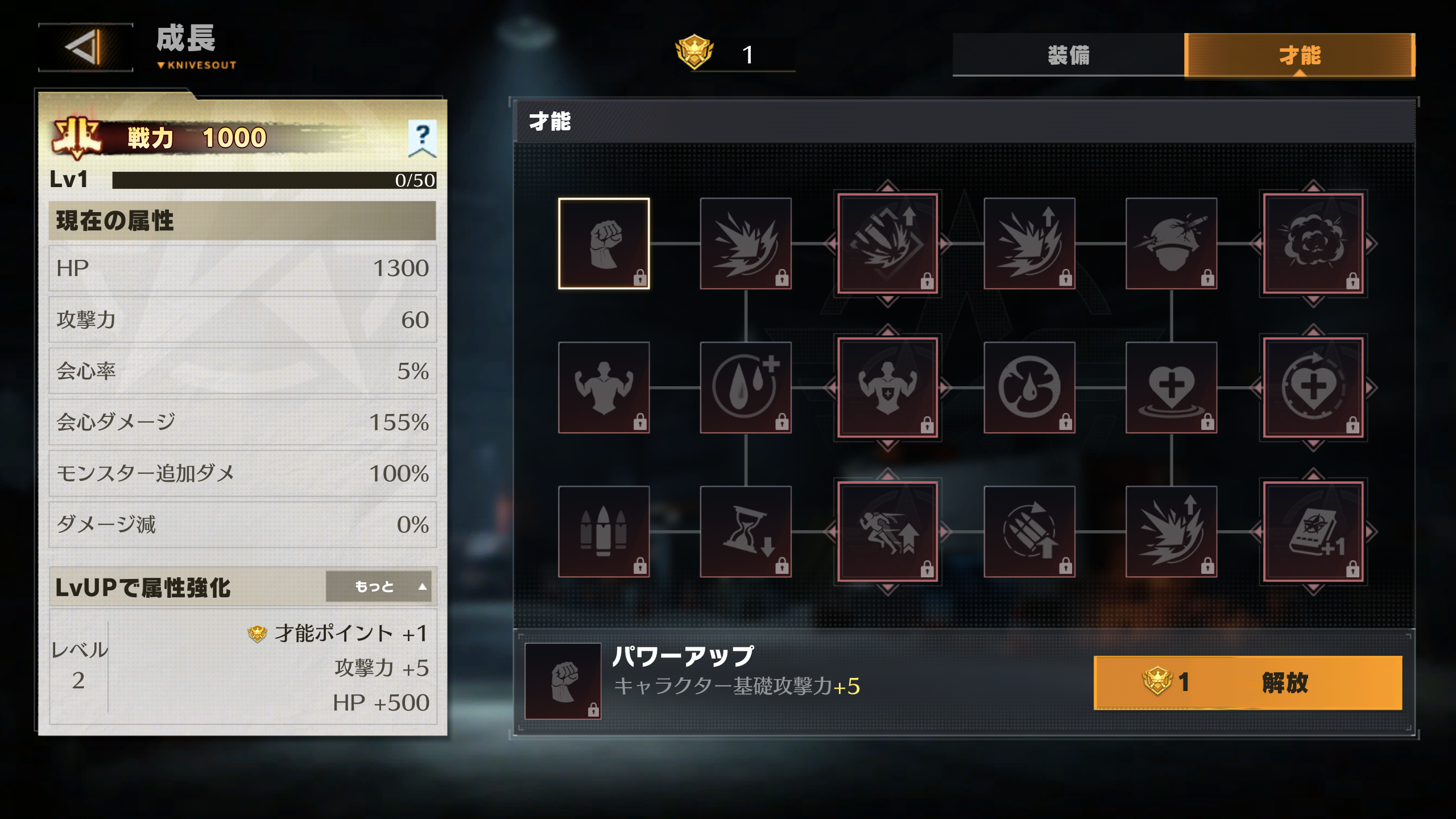 レベルアップで得られる才能ポイントを消費することで、追加能力を選択可能。道が繋がっている所のスキルを最大限まで上げているととなりのスキルを取ることができる。基本的には左側のスキルを取得していないとスキルは取得できない。