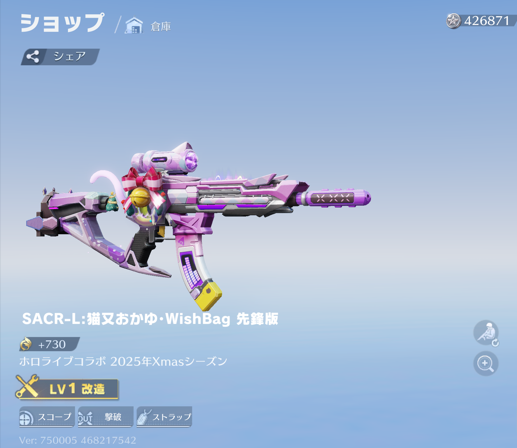 | 7 | SACR-L:猫又おかゆ・WishBag 豪華版 Ⅲ | 撃破エフェクト&納銃変化 | 銃器チップ・高級×5枚 |