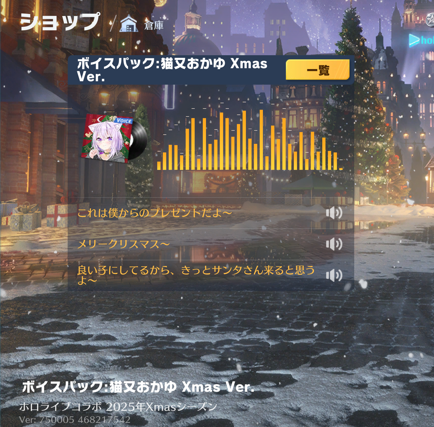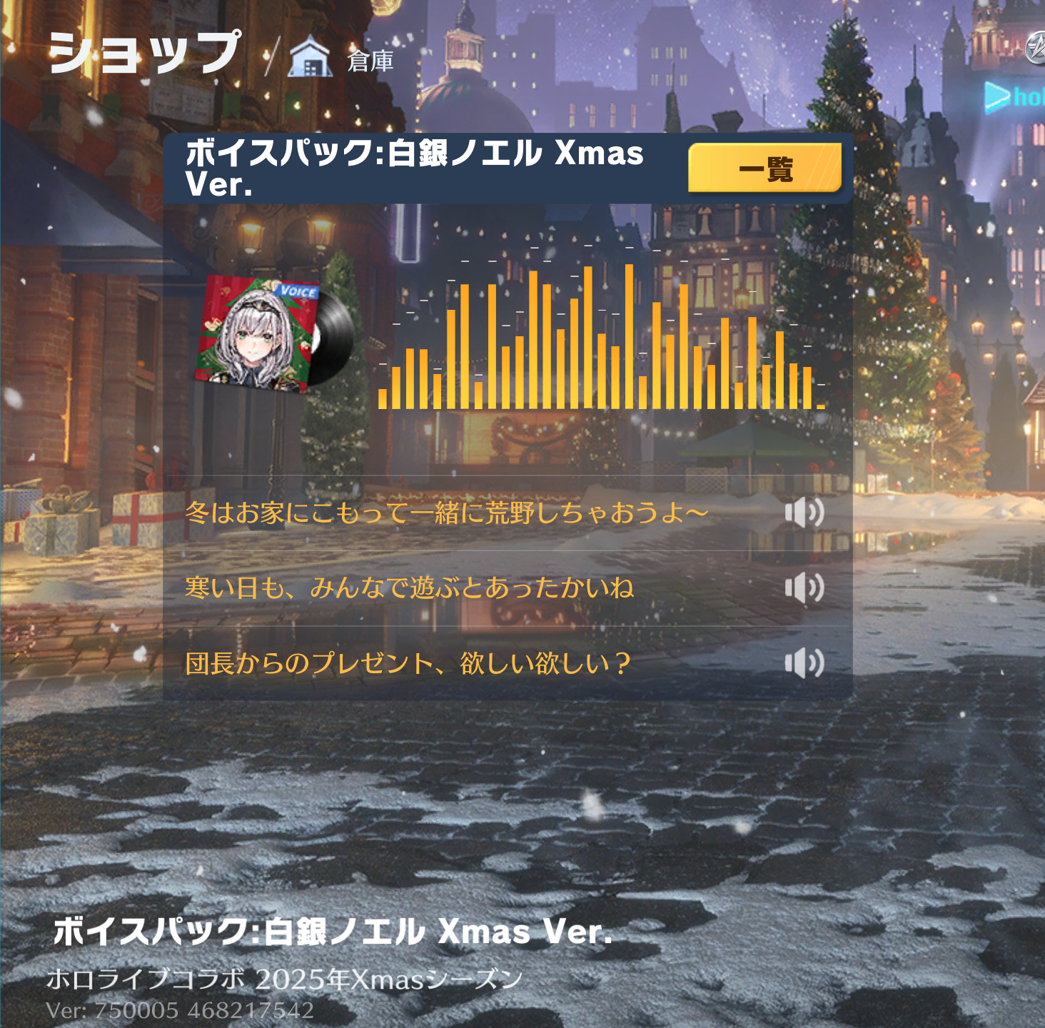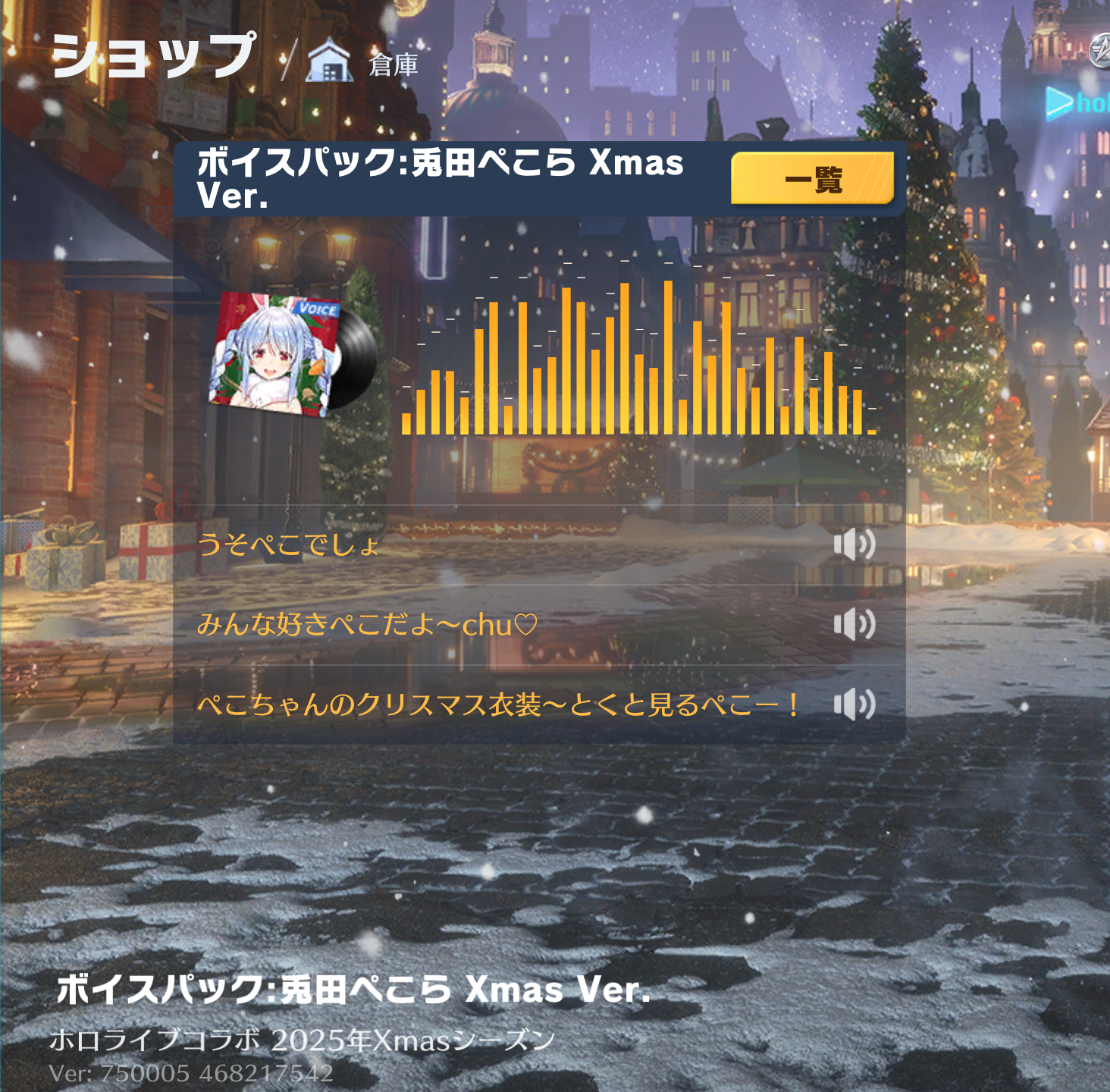 | 3 | 兎田ぺこら 荒野Xmas Ver. Ⅲ | 撃破ボイス | 衣装チケットLv6×12枚 |