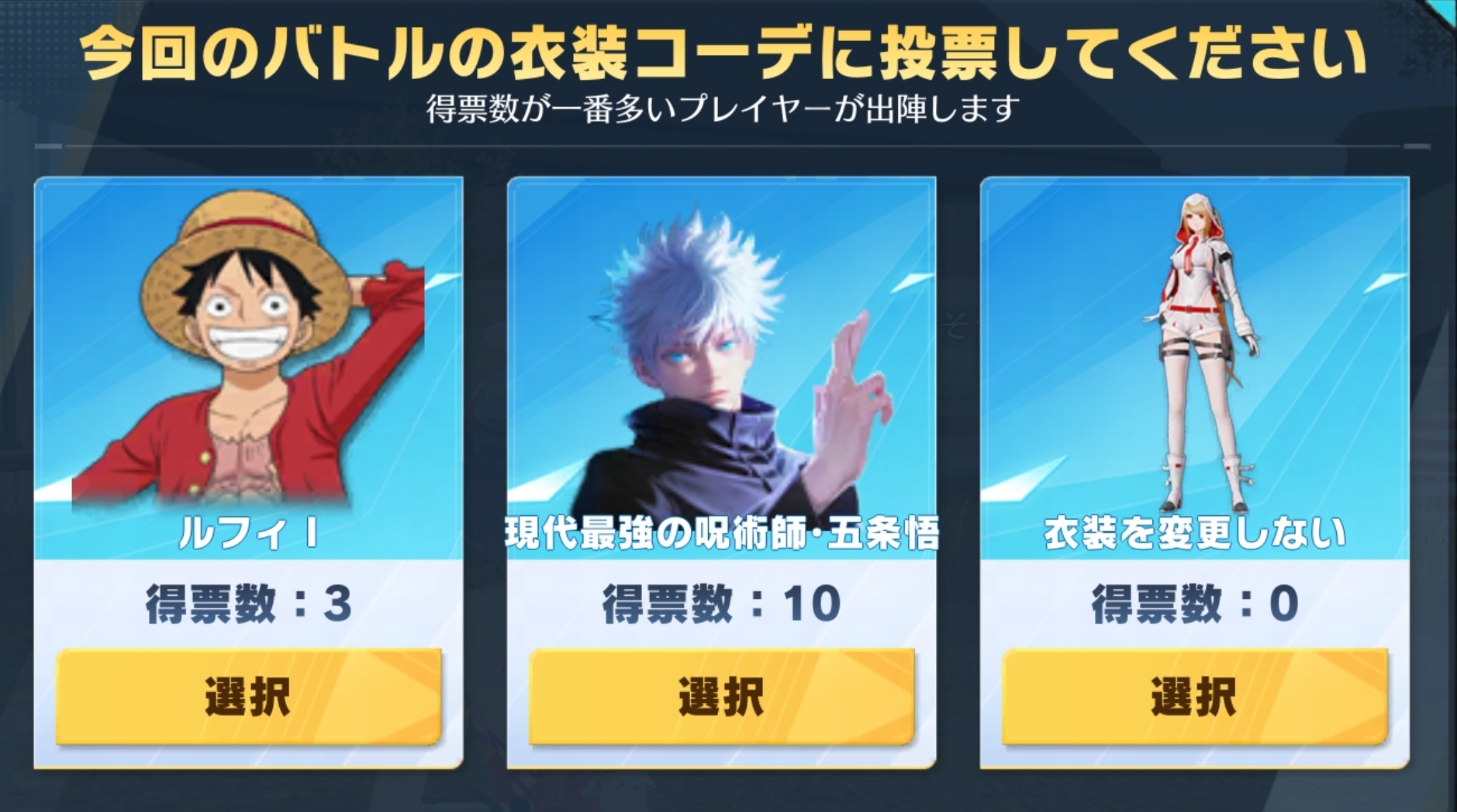 ※この衣装投票で選ばれた衣装が、その試合のミッション条件になる場合があります。
