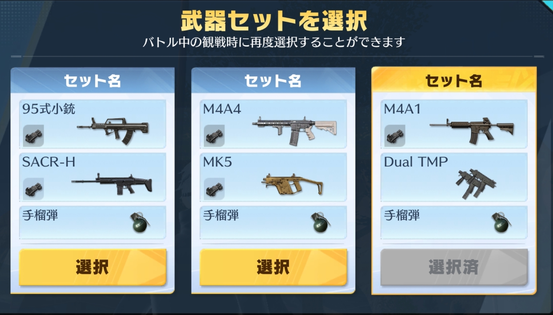 装備は3種類から選択可能です。大きな有利不利が出にくいので、基本は使いやすい武器を選びましょう。