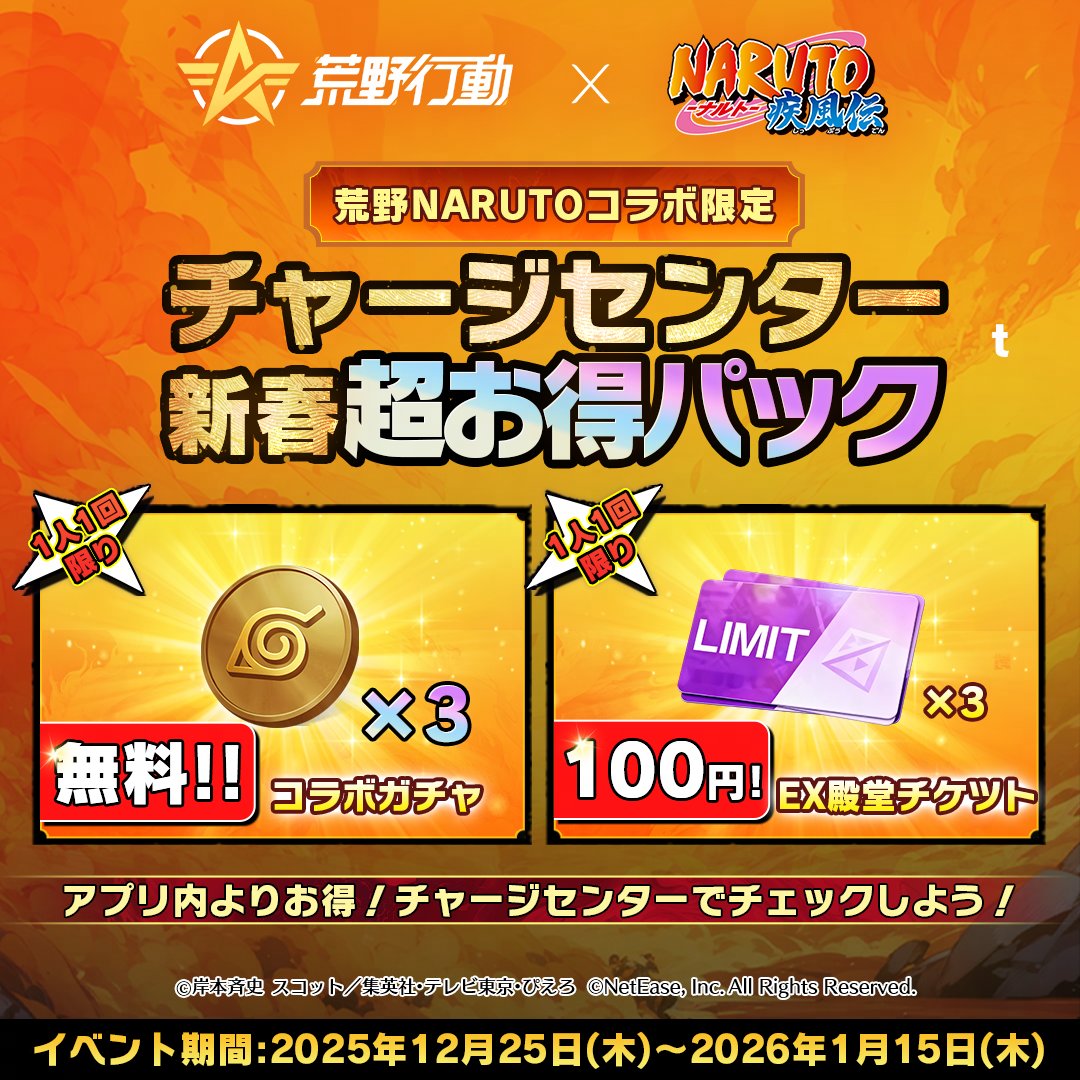 チャージセンターで、NARUTOコラボ限定の「新春超お得パック」が告知されています。