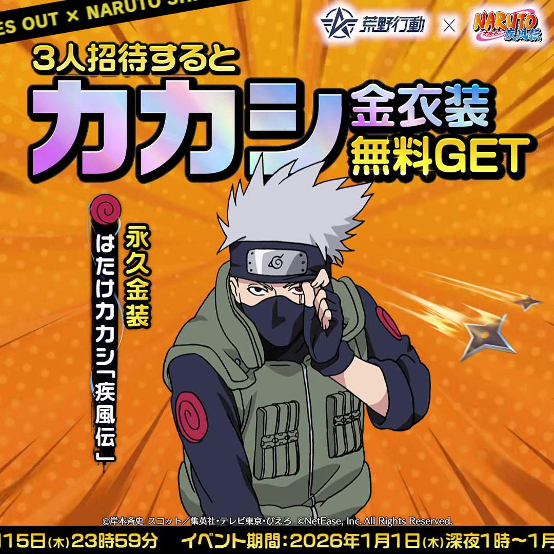 | カカシ金衣装(永久金装) | 3人招待 | 「はたけカカシ -疾風伝-」表記も確認 |