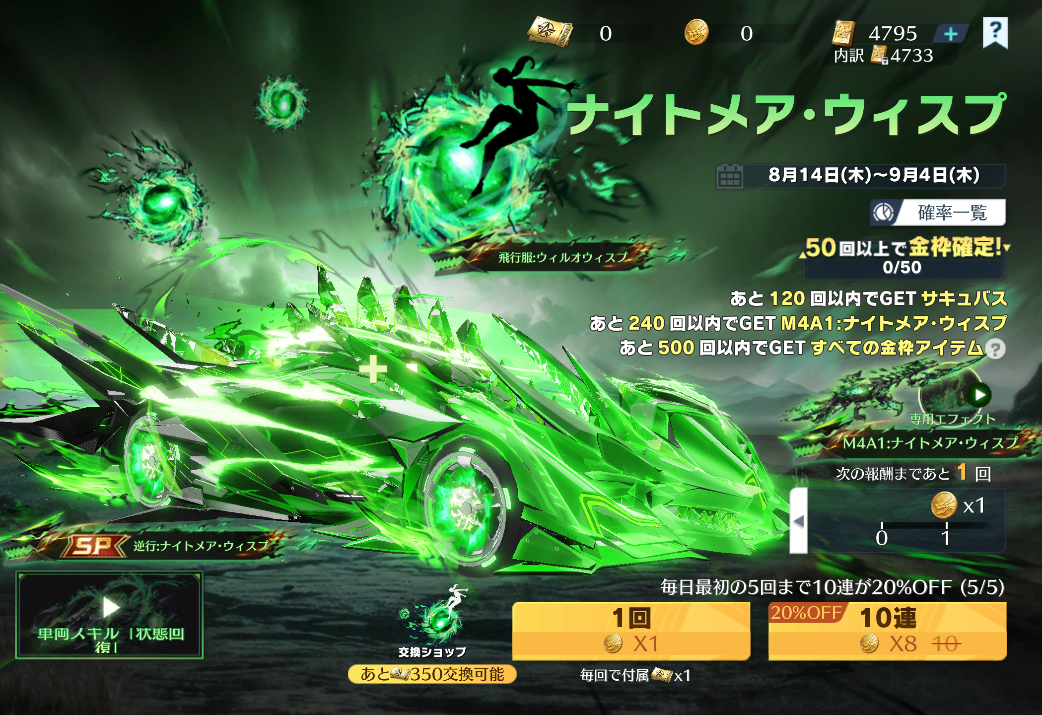 | 3 | 逆行:ナイトメア・ウィスプ Ⅲ | 9190 | 131.6 | 1400 | 68.75 | 22000 | 90秒 | 車両LvUPチケット・高級×150枚 |
