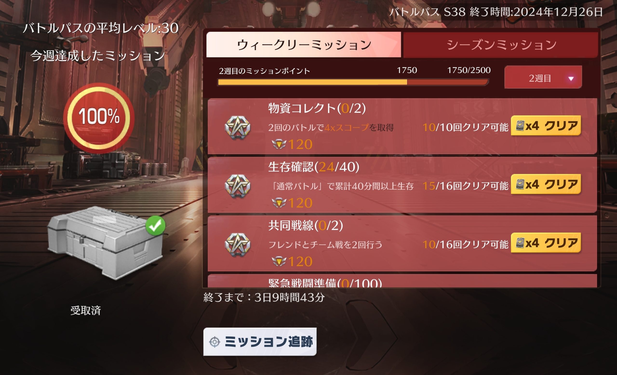 - ホーム画面→「バトルパス」→「ミッション」から確認可能